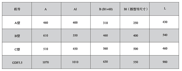 注: A型、B型、C型三档规格的尺寸以风量为依据,详见性能参数.