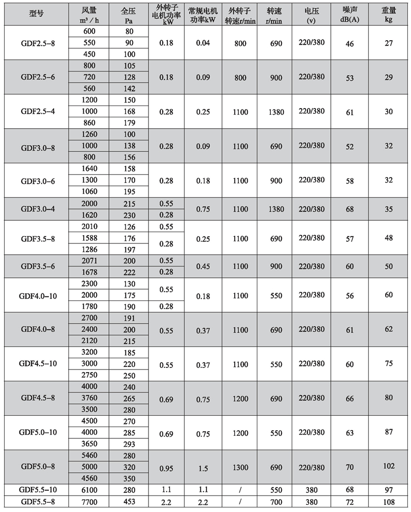 三、GDF系列离心式管道风机性能参数表