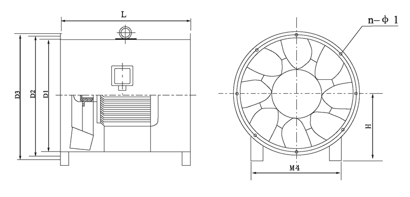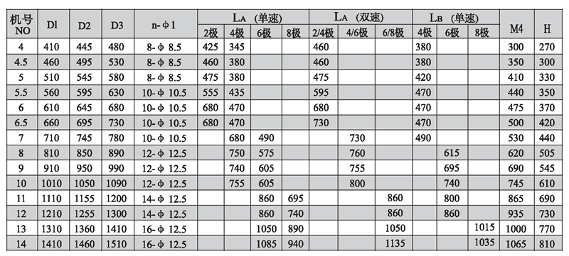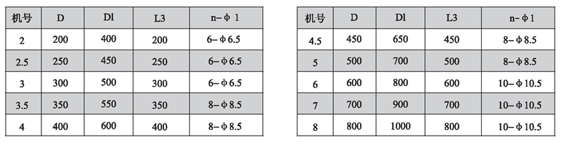 2.风机出厂时法兰一般不打孔n-φ1仅供参考,若要打孔请用户在订货时说明。