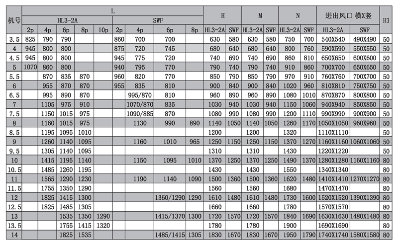 风机选用HL3- 2A或SWF系列风机,性能参数依照HL3-2A或SWF系列风机中同型号的性能参数。