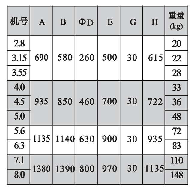 三、DWT-Ⅲ型风机外形及基础尺寸表(单位: mm)