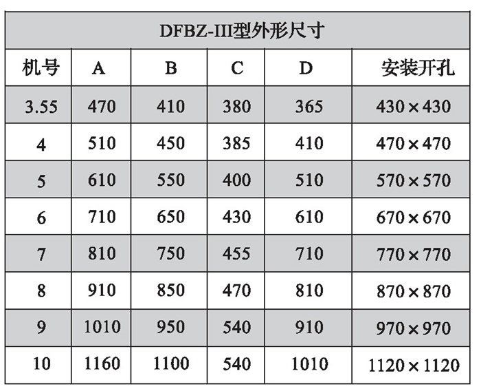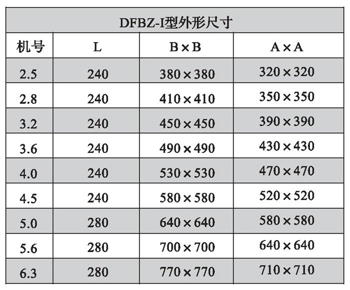 三、DFBZ型风机外形尺寸表(单位: mm)
